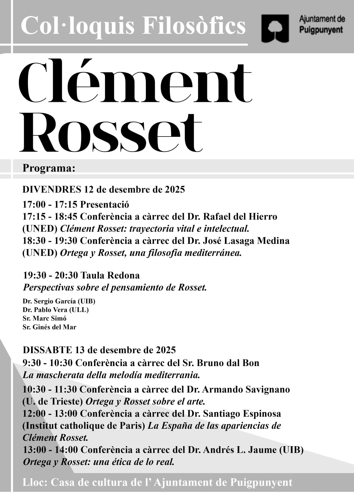 - Participation au colloque philosophique « Clément Rosset », Puigpunyent, Majorque (13.12.25) : « La España de las apariencias de Clément Rosset